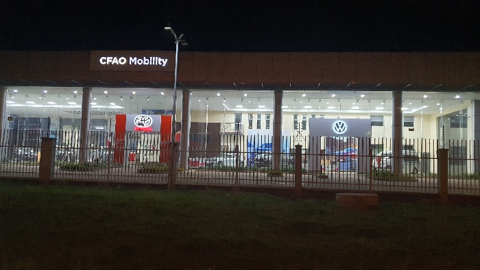 The photo shows a dealership at night, identified by the "CFAO Mobility" sign above