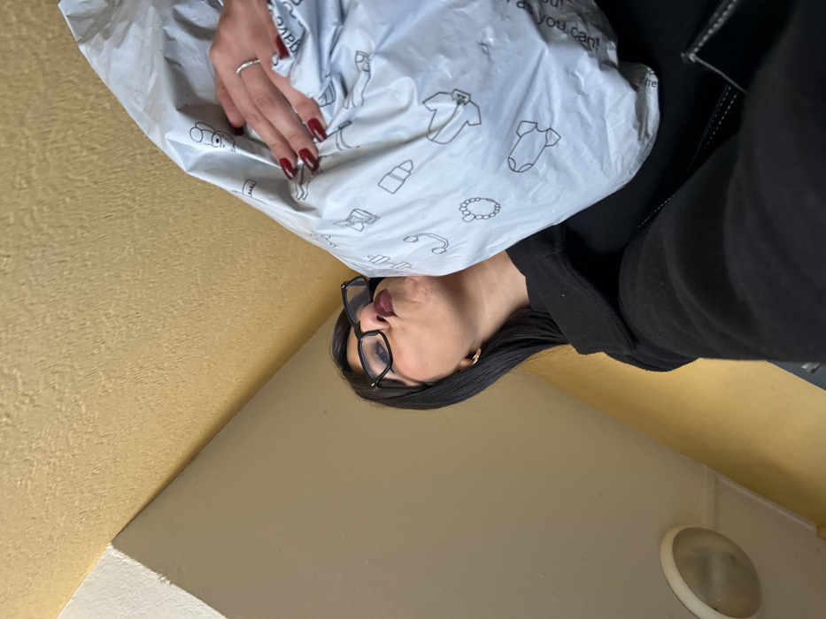A low-angle, indoor selfie depicts an individual, presumably female, with dark, straight hair, wearing black-framed glasses and dark red lipstick, striking a "kiss face" pose. She wears a black coat, and a small gold hoop earring is visible on her left ear. Her right hand, featuring dark red nail polish and a silver ring on the ring finger, holds or rests on a large, light-colored plastic bag. The bag is printed with black line-art illustrations, including a phone receiver, a necklace, a shirt, a shoe, an animal head (possibly a bear), a rocket, and partial text such as "you can!" and "gave." The background consists of a textured yellow-beige ceiling and a matching right wall, contrasted with a plain cream-colored left wall. A circular ceiling light fixture is visible on the lower left of the frame. This scene is situated indoors in the city of Strasbourg, France.