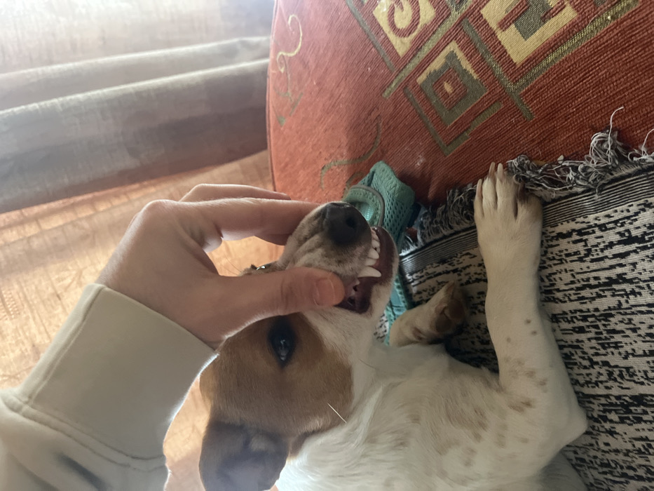 An indoor scene in Varna, Bulgaria, displays a human-animal interaction. A Jack Russell Terrier-type dog, primarily white with brown markings on its head and scattered light brown spots on its body, is depicted lying down. A fair-skinned human hand, partially obscured by a light-colored long-sleeved garment, is holding and pulling the dog's upper lip and snout upwards. This action exposes the dog's upper and lower canines and incisors, which are sharp and white. The dog's left eye (viewer's right) is visible and appears dark and calm. The dog is positioned on a dark-toned patterned textile, possibly a rug with fringes, while to its right, a reddish-orange cushion or blanket with golden, abstract embroidered patterns is visible. A small, teal-colored mesh object rests behind the dog's head. The background is softly blurred, showing light-colored curtains, indicating natural light entering the space.