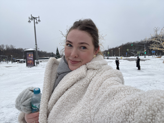 A fair-skinned woman with light brown hair, pulled back, is depicted taking a selfie outdoors in a snowy environment. She smiles faintly, looking directly at the camera. She wears a thick, white, textured "teddy bear" coat over a gray scarf. A golden earring is visible on her right ear. Her left hand holds a gray knitted hat and a translucent plastic bottle of "НОВГОРОДСКАЯ" (Novgorodskaya) branded water, with a light blue cap. She wears a ring on the fourth finger of her left hand. The background shows a wide, snow-covered open area, resembling a large square or park under an overcast sky. Several dark-colored streetlights, each featuring four lamps, are visible. To the left, a billboard displays a poster with Cyrillic text. Further back, a white bus is partially visible on a snow-lined road. To the right, a small, decorated Christmas tree stands next to a larger decorative tree-like structure adorned with lights. Two other individuals, dressed in dark winter clothing, are standing in the mid-ground on a cleared path. Green traffic lights are visible in the distance. This scene is identified as the VDNKh (Vystavka Dostizheniy Narodnogo Khozyaystva) complex in Moscow, Russia, characterized by its expansive avenues, distinctive lampposts, and winter decorations.