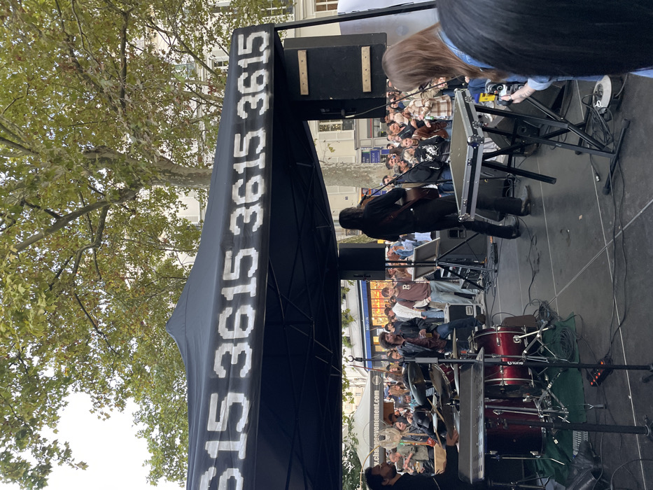 An outdoor live music performance is captured from the perspective of an audience member standing near the stage. The scene is set in an urban public space in Paris, France, identifiable by the distinctive Haussmannian architecture of the multi-story buildings in the background and the mature deciduous trees with green foliage. A black canopy tent, emblazoned with "3615 3615 3615" in white, pixelated font, covers a dark-colored modular stage. On the left side of the stage, a musician with dark, curly hair and a dark long-sleeved shirt is seated behind a red drum kit, which includes a bass drum, snare drum, and cymbals. To the right, another musician with long dark hair, wearing a dark long-sleeved shirt and dark pants, stands with their back to the camera, playing an acoustic guitar. A microphone stand is positioned in front of this guitarist. Two large black PA speakers flank the stage. Various cables, equipment cases, and stands are visible on the stage floor. A substantial crowd of approximately 50 to 100 individuals is gathered in front of the stage, observing the performance. Their attire is casual. In the immediate foreground on the right, an individual with long brown hair, wearing a denim jacket, holds a smartphone horizontally, appearing to record the event. In the mid-ground, a person with dark curly hair and a beard, wearing a dark jacket, holds a glass. Another person in the mid-ground wears a light brown sweatshirt with a white "R" logo. Partially visible banners in the background include text such as "changement" and "MUSEE," indicating either an event name or nearby establishments. The sky above is overcast.
