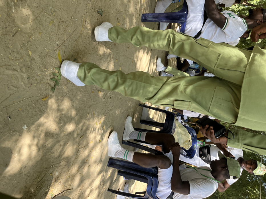 The image captures an outdoor gathering of approximately seven young adult males, identifiable as participants in the National Youth Service Corps (NYSC) program by their characteristic green and white attire