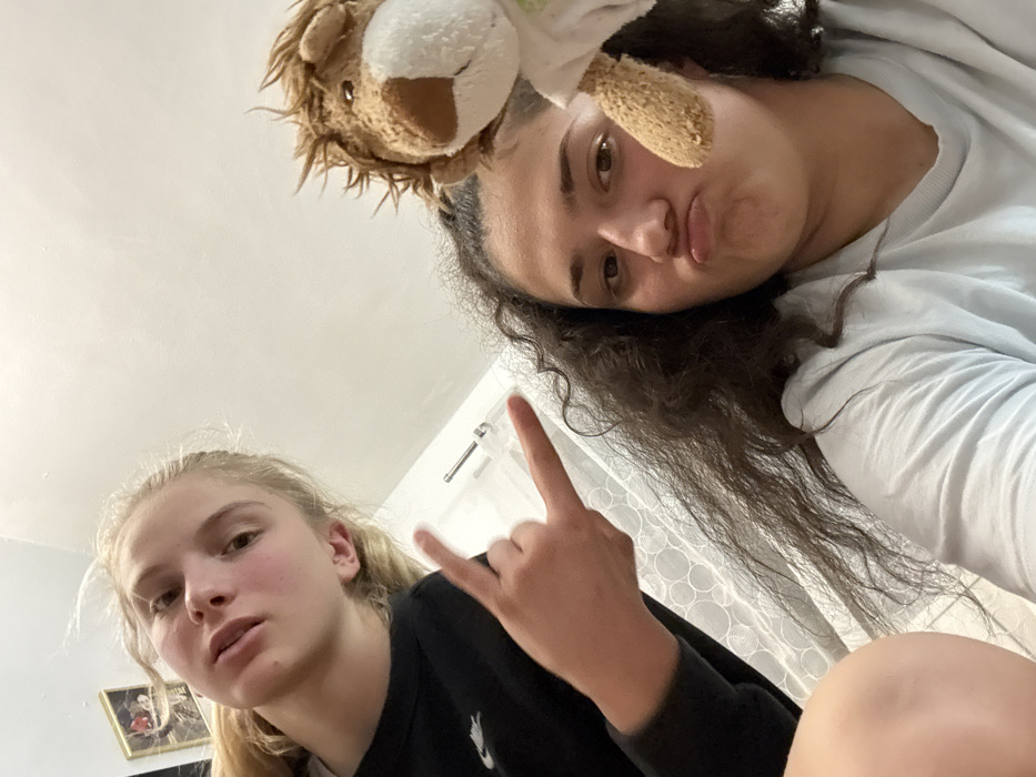 Two individuals and a plush toy are captured indoors, likely in Stara Zagora, Bulgaria, from a low-angle perspective. The background consists of a plain light-colored wall, a partially visible framed picture in the upper left, and a white curtain with a circular pattern draped beneath a metallic rod in the center-right. On the left, a blonde-haired female with fair skin wears a black long-sleeved top, partially displaying a white logo. She looks towards the camera with a neutral expression, her right hand raised, forming a "rock and roll" gesture with extended index and pinky fingers. On the right, a female with dark, curly hair, pulled back from her face, wears a light-colored short-sleeved top. She faces the camera with a puckered lip expression. A small, brown, plush toy, resembling a lion with a shaggy mane and a light-colored garment, is positioned on her right side, near her head.