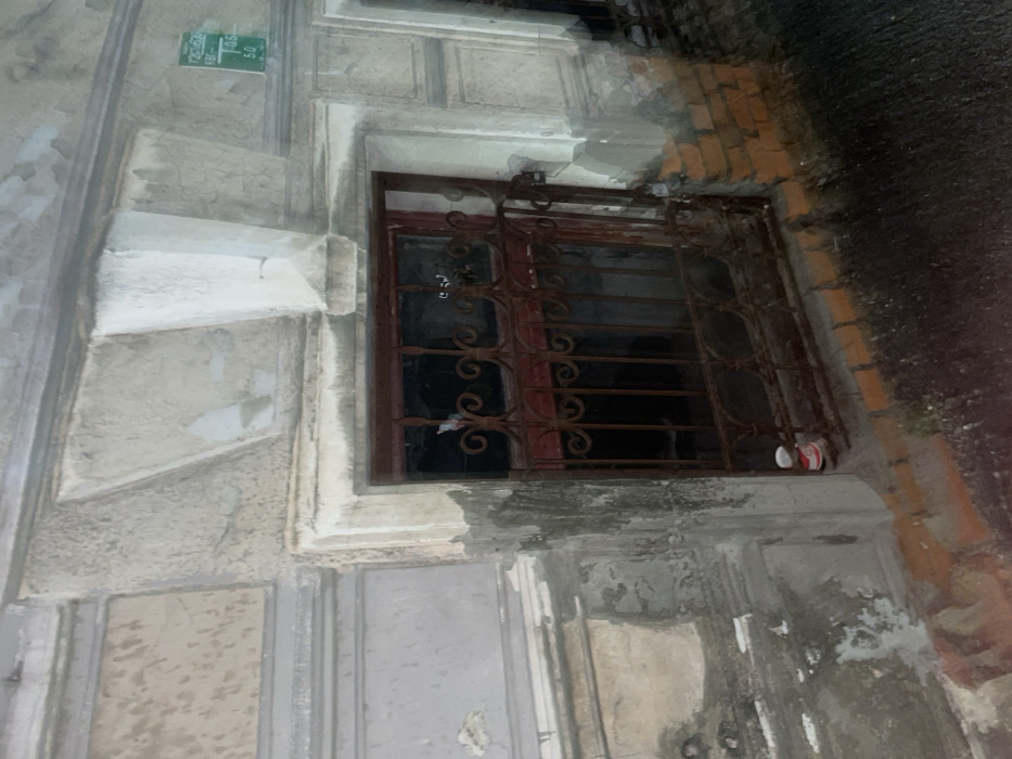 A weathered window with rusty, ornate bars sits in a decaying wall. The wall is adorned with paneling and layers of aged paint, showing signs of water damage and wear. To the right, the wall transitions into brick, partially obscured by darkness. A small green sign is visible above the window. The scene evokes a sense of abandonment and urban decay.