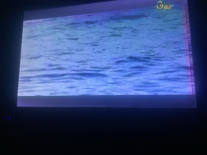 A television screen displays moving blue water. The water's surface is rippled, reflecting light. In the top right corner is a logo with "Gold TV" printed in green letters. Vertical colored lines disrupt the picture on the right edge of the screen, indicating a possible display issue. The surrounding environment is dark.