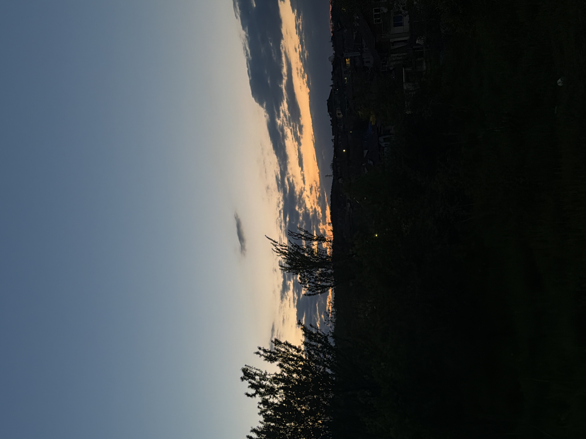 twilight scene in Airovo, Bulgaria. The sky transitions from blue to a warm orange/yellow where the sun has set, with dark, layered clouds scattered. Silhouetted trees and possibly bushes are in the foreground, making the bottom half of the image significantly darker. In the midground, the vague outline of a building or house is visible, situated on what appears to be a small hill or slope.