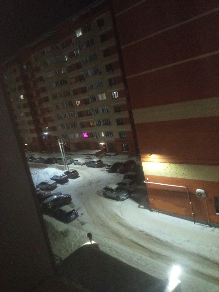 A nighttime scene reveals a snow-covered parking area nestled between buildings. On the left, a tall apartment complex with numerous lit windows dominates the view, while a closer, orange and white building is on the right. Cars parked in the snow-covered lot create a wintery urban view. The image is taken from indoors, looking out through a window at the wintry scene.