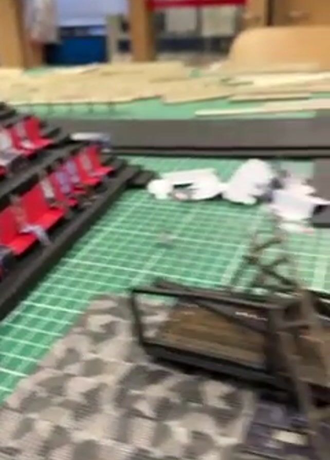 room with several people working on what appears to be model-making projects. The first shot displays a tiered seating structure populated with paper cutouts of people in a variety of outfits. The shot pans right to reveal an assortment of tools and materials used to construct the models, including foam boards, glue, paint, and brushes. The video also shows an area where at least two people are working on painting larger pieces of board with blue and black paint, possibly for a backdrop or base for their models. One person is using a laptop nearby. The environment looks like a workshop or studio.