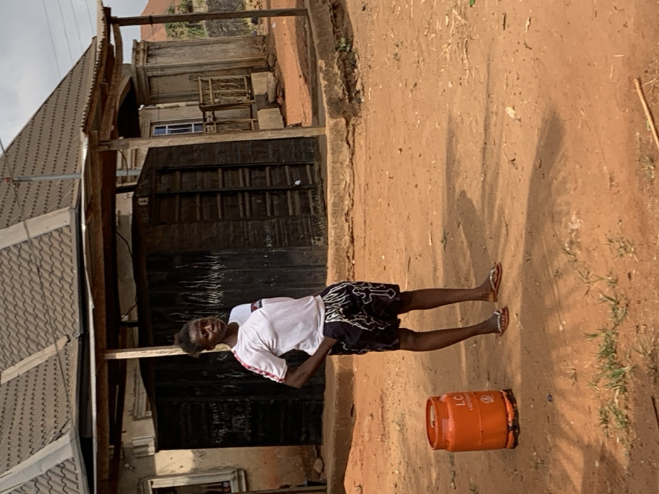 The image depicts an outdoor scene in Aguleri, Nigeria, under daylight conditions. A single individual, appearing to be an adult female with dark skin and dark hair tied back, stands centrally on an unpaved reddish-brown dirt ground. She is wearing a white short-sleeved t-shirt with red and blue stripes on the sleeves and a small logo on the left chest, dark shorts featuring white cross and abstract designs, and red and gold flip-flops. Her hands are positioned on her hips, and she looks slightly to her right (viewer's left) with a neutral expression. To her left, an orange LPG gas cylinder with "LC LADIGAS" visible on its side rests on the ground. Behind the individual, a building structure is visible, featuring a brown tiled roof, wooden support beams for an overhang, and a dark wooden gate or door. To the right of this dark gate, another section of the building includes a lighter-colored concrete wall, a window, and a metal railing. A raised concrete or earthen curb runs horizontally across the midground. The ground features sparse patches of green grass, and shadows are cast, indicating bright sunlight. A wooden stick or pole lies on the ground in the bottom right corner.
