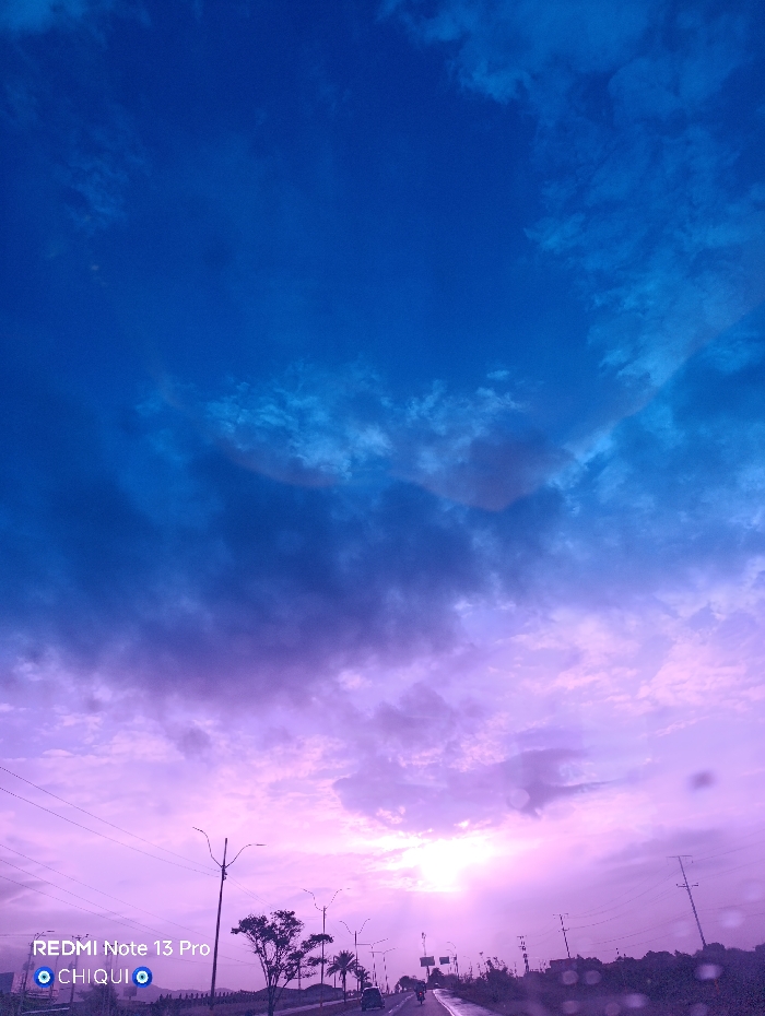 The image displays a wide-angle view of a highway scene captured during either sunrise or sunset in El Dátil, Venezuela. The sky occupies the majority of the frame, presenting a gradient of colors from deep blue in the upper portion, transitioning through lighter blues and grays, to vibrant purples and pinks closer to the horizon. Various cloud formations, dark blue and purple, are distributed across the sky. A bright, localized glow, characteristic of the sun, emanates from the lower right segment of the sky, casting a strong pink and purple hue on the lower clouds and atmosphere. Below the horizon, an asphalt roadway extends into the distance, appearing wet and reflective, indicative of recent precipitation. Faint lane markings are visible on the road surface. Along the left side of the road, multiple modern streetlights with dual fixtures are present, alongside a single deciduous tree with dark foliage. On the right side, similar streetlights and several utility poles carrying power lines line the road. Green vegetation, consisting of bushes and trees, borders the right edge of the roadway. Multiple vehicles are visible on the road; a dark-colored vehicle is in the mid-distance on the left, and another, possibly a motorcycle or small car, is further ahead in the right lane. No individuals are visibly present. A digital watermark "REDMI Note 13 Pro" followed by "CHIQUI" and two blue evil eye symbols is located in the bottom left corner of the image.