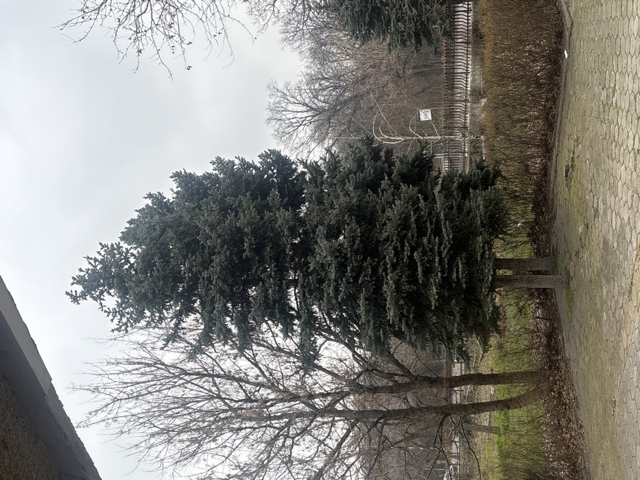 The image depicts an outdoor scene in Plovdiv, Bulgaria, likely during late winter or early spring under an overcast sky. The viewpoint is slightly elevated, with a grey concrete overhang visible in the upper left corner, suggesting the photo was taken from a balcony or window. In the immediate foreground, a weathered, grey-toned hexagonal paver path is visible, with minor dirt accumulation and two small pieces of white debris. This paving transitions to a strip of dry, brown shrubbery and fallen leaves. Dominating the midground is a tall, dark green conifer, possibly a spruce or fir, with two distinct trunks merging from the ground level. To its left stand two slender, leafless deciduous trees. Behind these trees and shrubs, a patch of sparse green grass is visible. A dark metal fence with vertical bars and ornamental scrollwork runs horizontally across the mid-distance, separating the immediate area from a more extensive wooded zone. Within this wooded zone, another smaller conifer is partially visible on the right, and a slender, light-barked tree, possibly a birch, stands with a small, illegible white rectangular sign affixed to it. The background consists of a dense arrangement of dormant deciduous trees with bare branches, extending to the horizon. The sky is uniformly light grey, indicating heavy cloud cover. No individuals or human activity are present in the scene.