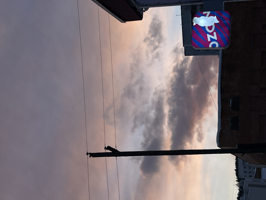 The image depicts an urban scene in Ust-Ilimsk, Russia, at dawn or dusk, characterized by soft light and a colorful sky. The upper half of the frame is dominated by a sky featuring shades of purple, pink, and orange, with darker streaky clouds. A tall, dark utility pole stands prominently in the mid-ground, extending vertically from the lower-left quadrant, supporting several horizontal utility wires via insulators. Below and to the left of the pole, the upper section of a reddish-brown brick building with a snow-dusted flat roof is visible; two rectangular vents are present on its visible side. To the right, an illuminated square-shaped commercial sign for "OZON" is affixed to a building's light-colored wall. The sign displays "OZON" in white capital letters on a magenta and blue striped background, with a white, stylized figure (resembling an owl) on the right side of the logo, appearing partially obscured or damaged. The roofline of the building bearing the sign is visible above it. In the distant background on the far left, multiple light-colored buildings are faintly discernible against a dark, tree-covered hillside, suggesting a wintry landscape. No people, active interactions, or specific actions are visible within the frame.