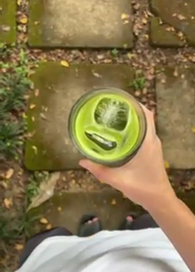 A first-person perspective video shows a person holding a glass of green matcha drink with ice while walking on a stone path