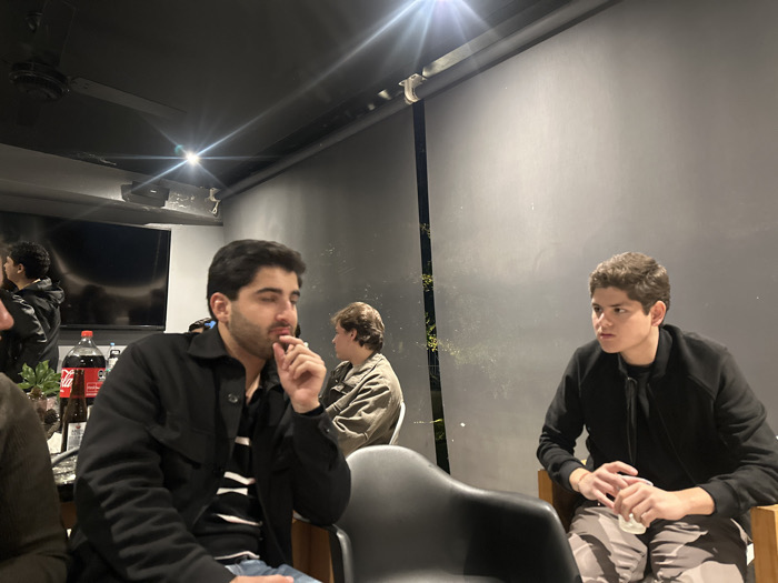 Several young men sit in a dim room with dark grey walls. One man in the foreground wears a black jacket and holds a cigarette to his lips. Another man sits to the right in a black jacket and patterned pants, gazing off to the side. In the background, a TV screen reflects another man and there is a bottle of Coca-Cola visible on the table. Artificial light fixtures shine from the ceiling.