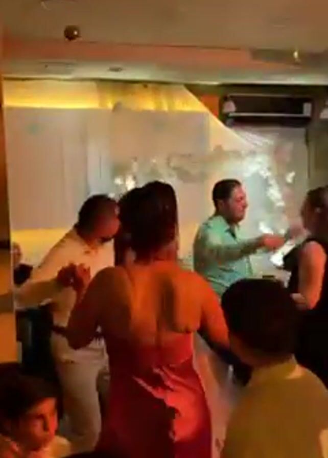 crowded room, likely a party or celebration. Several adults are dancing to upbeat music. A woman in a purple dress is facing away from the camera, dancing closely with a man in a white shirt. A young boy in a white shirt stands in the foreground. A man in a blue shirt is seen dancing with a woman in a black dress. In the background, there's a decorated wall with white fabric and what appear to be white floral decorations. The lighting in the room is colorful.