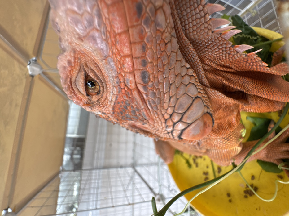 In Baan Nai Wok, Thailand, a close-up image captures the head and upper body of an orange-red iguana