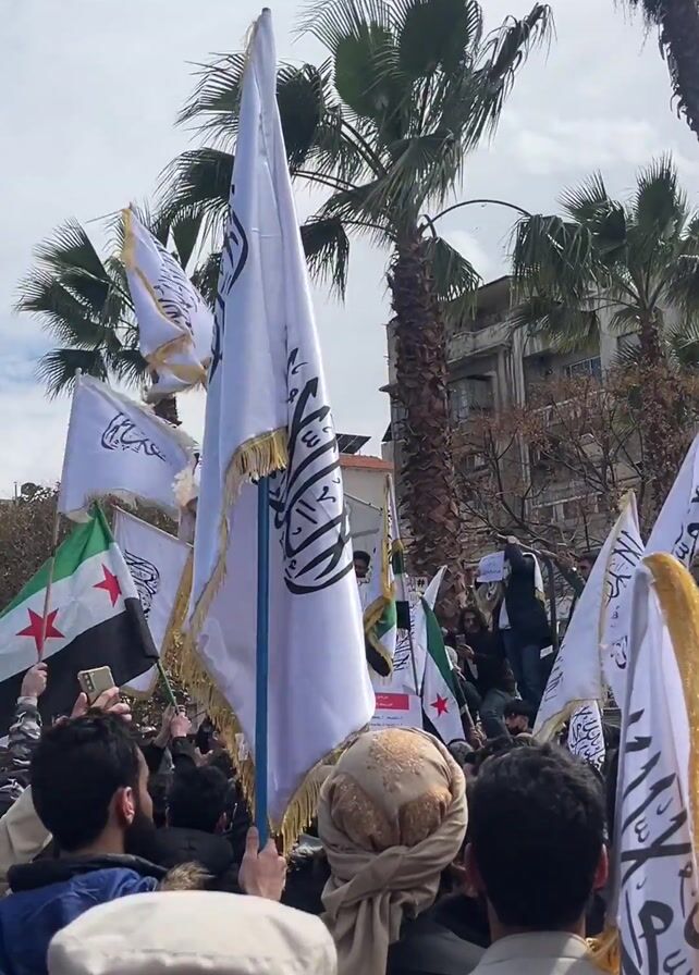 A crowd of people is gathered outside in an urban area, waving flags. Most of the flags are white with black calligraphy on them and fringed with gold. Some of the flags are those of Syria, with the characteristic three stars and red, white, and black stripes. Palm trees can be seen in the background, as well as buildings. Some people in the crowd are holding up their phones, possibly recording the event. One man wears a turban. Someone appears to be speaking into a microphone from atop a raised structure.