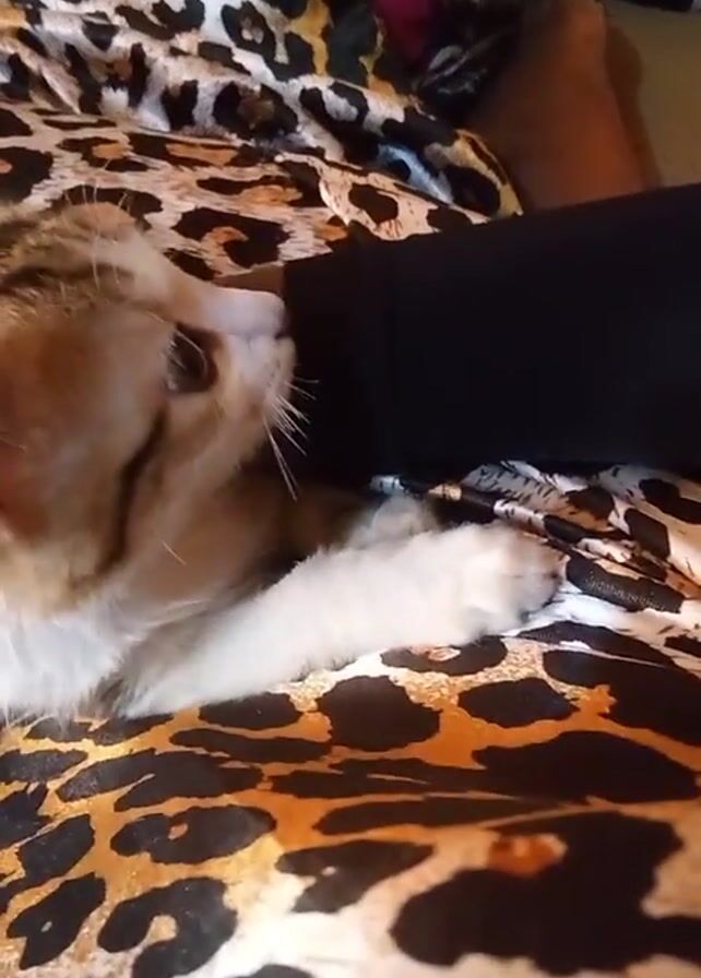 The video begins with a close-up of a light brown and white kitten sitting on a person's lap. The person is wearing black pants and a leopard print top. The person pets the kitten with their hand. The kitten then jumps off the person's lap and onto the floor. The floor is carpeted in a brown color. A leopard print top is still visible.