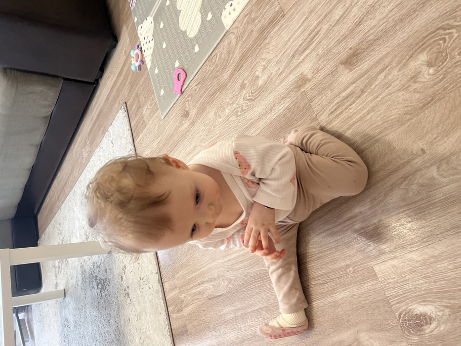 This image captures an indoor scene within the city of Mytishchi, Russia. A single infant, with light-colored hair and blue eyes, is seated on a light brown laminate wood-grain floor. The infant wears a white, long-sleeved top patterned with light pink shapes, light brown pants, and light-colored socks featuring pink non-slip grips on the soles. The subject's hands are clasped at the chest, and the head is tilted downwards. In the foreground-left, a section of a textured light-colored rug and a white table leg are visible. To the right, a grey play mat adorned with white cloud and geometric patterns is positioned on the floor. Two small plastic toys, one pink and ring-shaped, the other multi-colored (pink, purple, blue, white) and ornate, rest on the play mat. A dark-colored sofa is visible along the rear wall, partially obscured by the floor and play area.