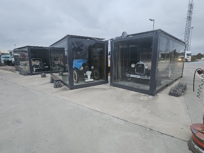- "This image displays an outdoor scene in Tudela, Spain, featuring four vintage automobiles presented within modified shipping containers with transparent glass fronts" by FM-bCw3N2, licensed under CC BY 4.0