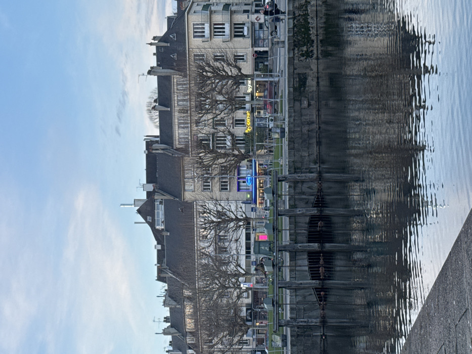 The image depicts the Écluse de l'Orne (Orne Lock) and Quai Vendeuvre in Caen, France, viewed across a body of water looking eastward towards the Bassin Saint-Pierre. In the foreground, a dark, reflective body of water occupies the lower half of the frame, showing ripples and reflections of the distant structures. A concrete embankment is partially visible in the bottom-left corner. Spanning the waterway horizontally in the mid-ground is a stone and concrete lock gate structure. It features three visible openings below the waterline, each secured by metal grates. Vertical wooden supports and horizontal beams are present above these openings. Mounted on the top walkway of this lock structure is a greenish-bronze sculpture of a person riding a bicycle, facing towards the right side of the frame. Mechanical operating equipment is visible on the lock structure's surface. Behind the lock, a paved urban street runs parallel to the water. Metal safety barriers line the street's edge. Several bare deciduous trees with dark, intricate branches are spaced along the street, partially obscuring the lower floors of the buildings behind them. A red passenger vehicle is parked on the street near the center. Two human figures, indistinct due to distance, are observed walking on the street towards the right, near the far edge of the frame. The background is dominated by a continuous facade of multi-story buildings. These structures exhibit light-colored (beige or grey) exteriors, numerous rectangular windows, and dark, steeply pitched roofs with various dormers and chimneys. Commercial establishments are visible at street level with illuminated signs: a blue neon sign reading "HOTEL" on the left, another bright blue neon sign further right, a yellow neon sign spelling "Le Camp," and an adjacent yellow sign indicating "Restaurant." The building on the far right features multiple balconies with white railings. The sky is light blue with scattered thin white clouds, suggesting late afternoon or early evening, with artificial lights from the commercial signs illuminated.