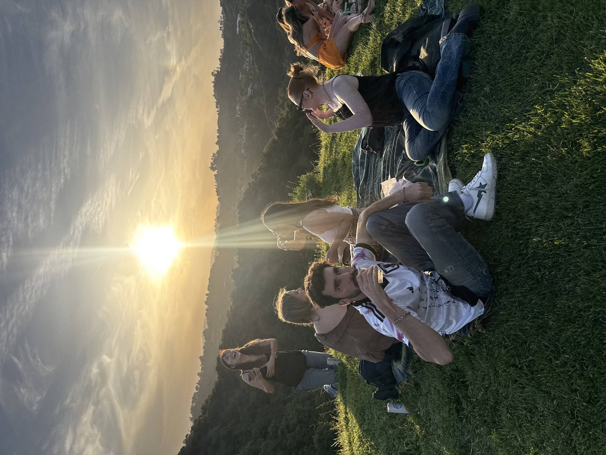 A group of people is sitting on a grassy hill overlooking a valley at sunset