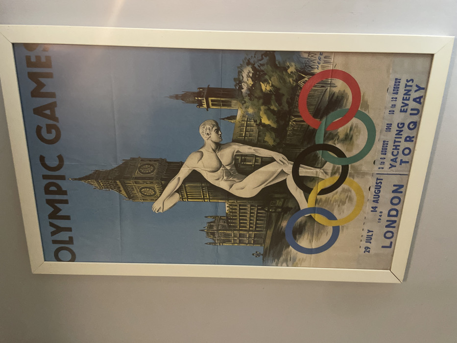 A white-framed, vertically oriented poster depicting the 1948 Olympic Games hangs on an unadorned light grey wall in Donja Lastva, Montenegro