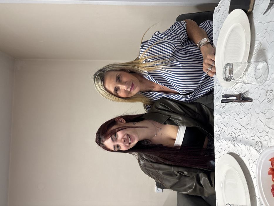The image depicts two seated females at an indoor dining table. The specific location within Petah Tikva, Israel, cannot be determined from the visual evidence. The individual on the left is a younger female with long, dark reddish-brown hair, smiling directly at the camera. She wears a dark olive-green collared jacket over a black and white strapless top and a silver V-shaped necklace. A small ear piercing and a possible small tattoo on her left neck are visible. The individual on the right is an older female with blonde hair, smiling directly at the camera. She wears a blue and white vertical striped collared shirt, partially unbuttoned. Her left hand displays multiple rings on the index, middle, and ring fingers, and a silver watch with a white face on her wrist. A silver necklace is also visible. Both individuals are positioned behind a table covered with a white tablecloth featuring a subtle embossed floral or leaf pattern. On the table, two white dinner plates are present. Between the plates, a fork and knife are positioned. An inverted clear drinking glass rests near the right plate. A small white bowl containing chopped red food, possibly tomatoes, is partially visible in the bottom-left foreground. A dark-colored smartphone is partially visible on the table to the right of the glass. The background consists of plain, light beige walls. A dark-colored sofa or bench is partially visible behind the individuals. A white electrical outlet is affixed to the left wall.