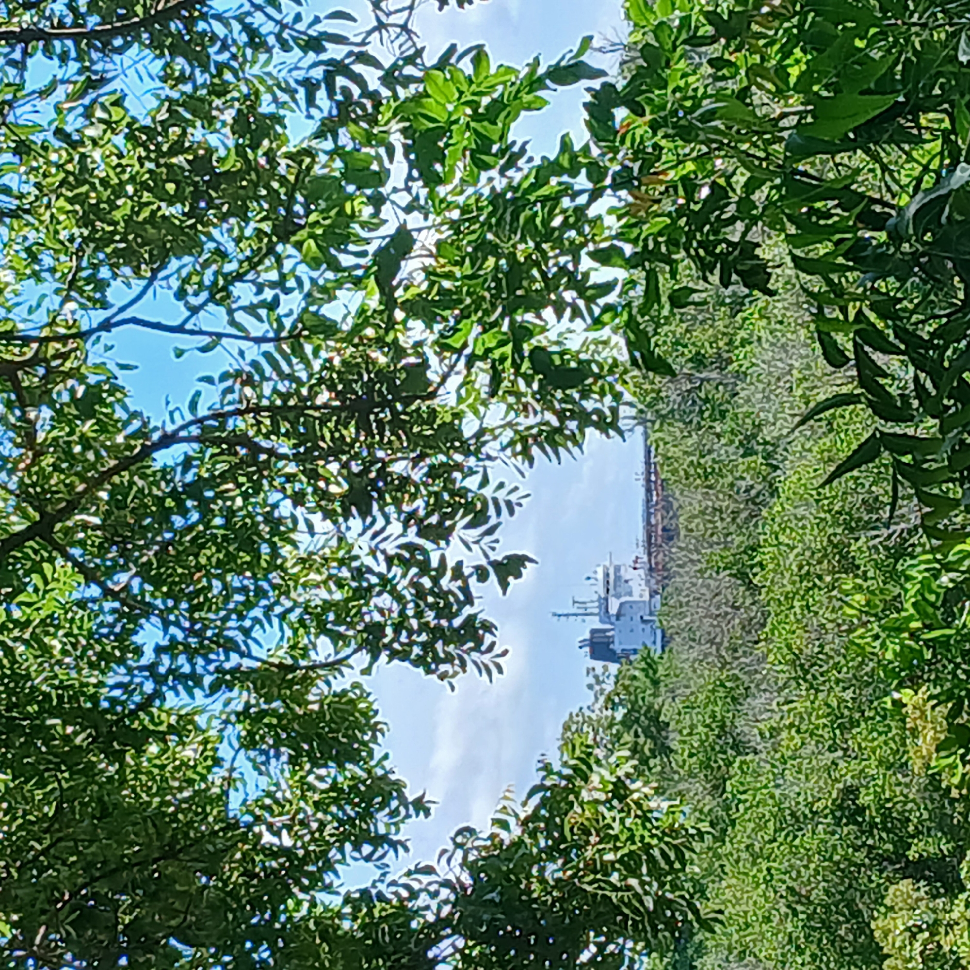 - "The image displays a distant, large cargo or tanker vessel seen through an irregular frame of dense green foliage in the immediate foreground" by FM-tjCYg2, licensed under CC BY 4.0