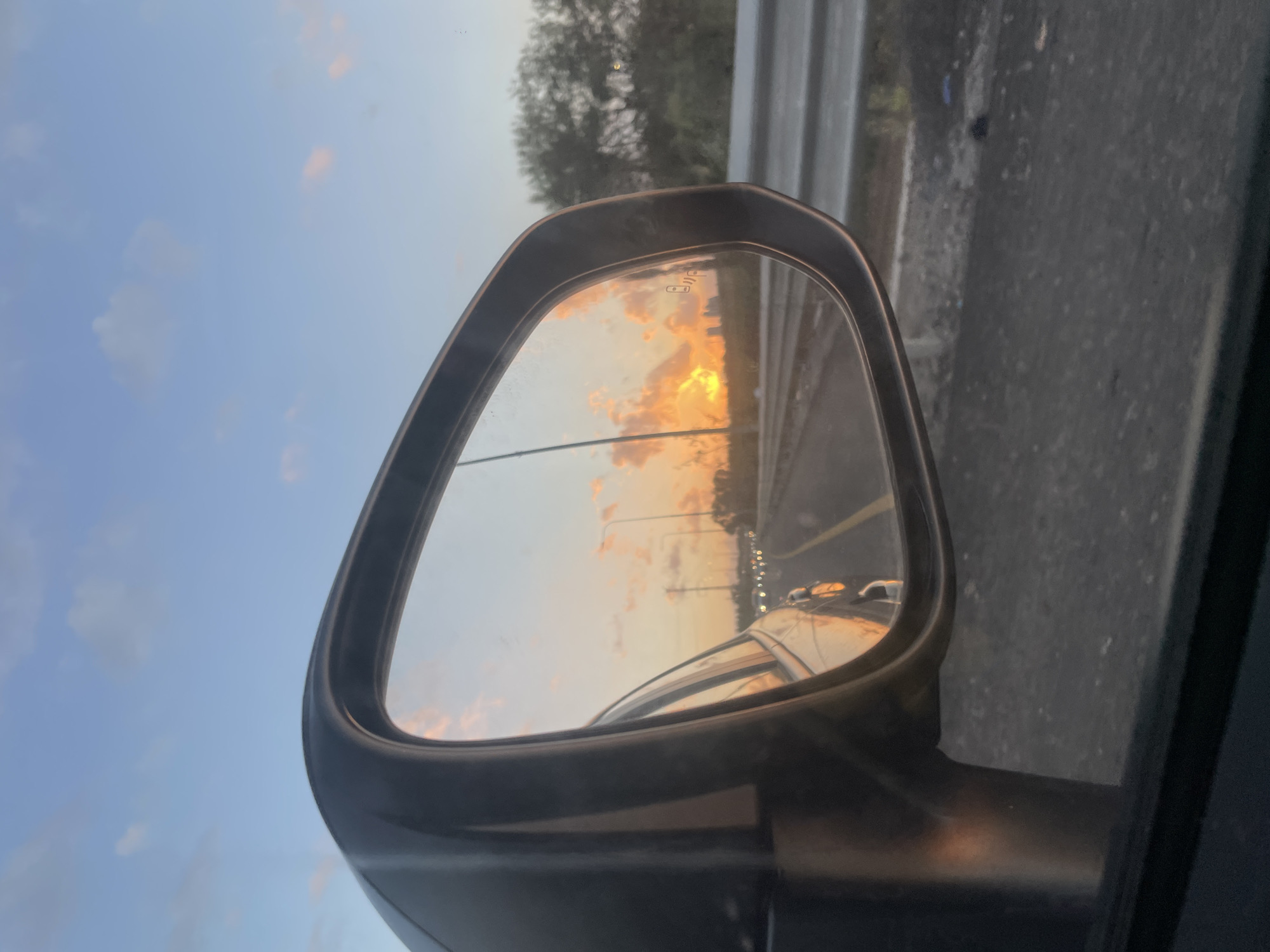 The image depicts a car's side-view mirror reflecting a sunset scene on a highway