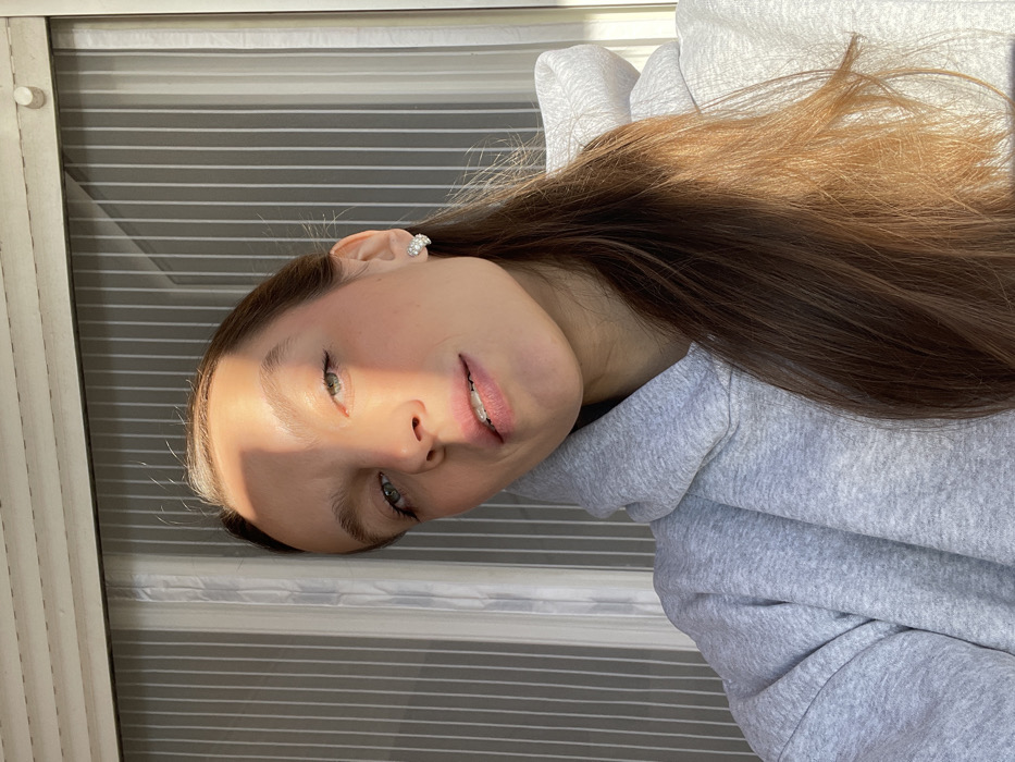 The image presents a close-up, chest-up portrait of a young adult female, positioned facing forward and looking directly at the camera. She exhibits fair skin, blue-green eyes, light brown eyebrows, and pink lips, revealing orthodontic braces on her upper teeth. Her long, straight brown hair, featuring lighter streaks, cascades over her right shoulder and chest. She is dressed in a light grey hooded sweatshirt. A small, light-colored stud earring is visible in her right ear. Direct natural light illuminates the right side of her face and hair, creating a distinct shadow across her forehead and the left side of her face. The background consists of a light-colored window blind or insect screen characterized by vertical stripes, framed by a horizontal element at the top. The setting appears to be an indoor or balcony area within a residential context in Budva, Montenegro.