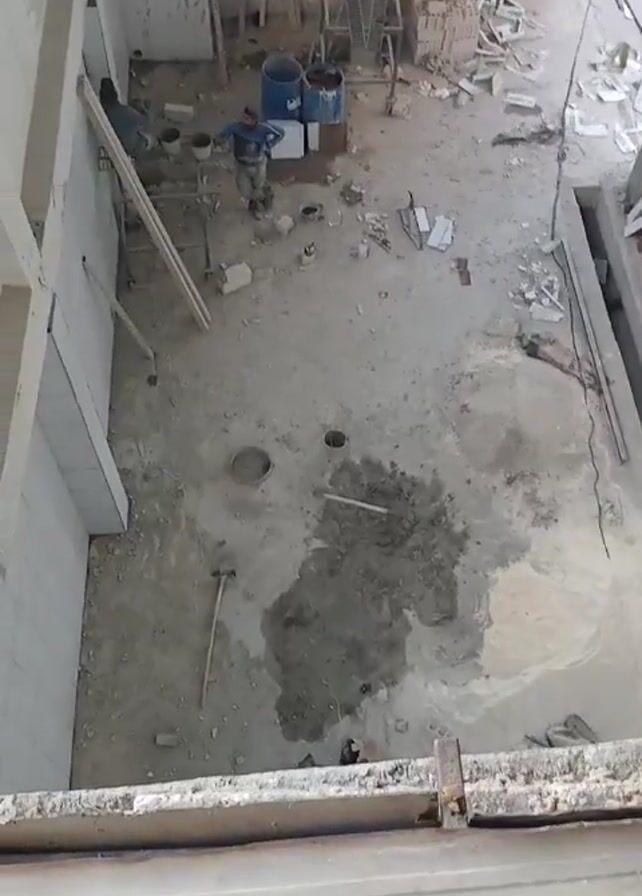 interior of a building under construction, filmed from an elevated position. Two construction workers are visible on the ground floor, working near buckets and materials. The floor is mostly concrete, covered in debris and damp patches. A hammer lies on the ground. The camera angle rises to show a partial second floor with unfinished stairs, and then to the corrugated metal roof supported by a metal frame. Another worker is visible on scaffolding near the roof. There is also a cement mixer on the second floor.