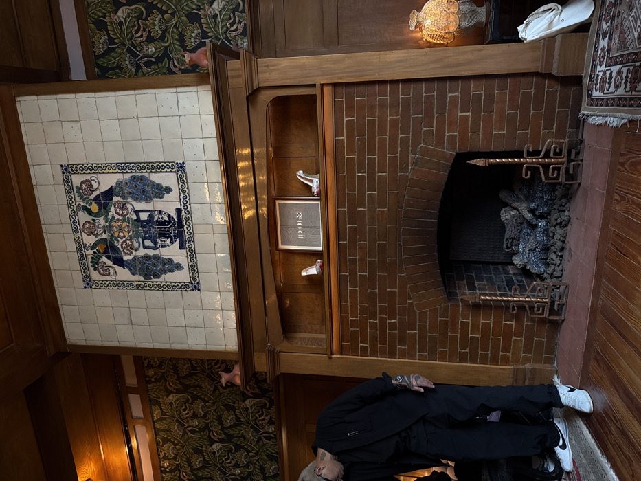 An ornate fireplace is the backdrop for a person lying on the floor. The fireplace features brickwork, an arched opening, and decorative metal supports. Above, a light fixture glows near a white object. To the left, a tiled wall design hangs over patterned wallpaper. A shelf next to the fireplace contains framed artwork and shoes. The person wears a black outfit and white sneakers. A section of patterned rug appears on the right.