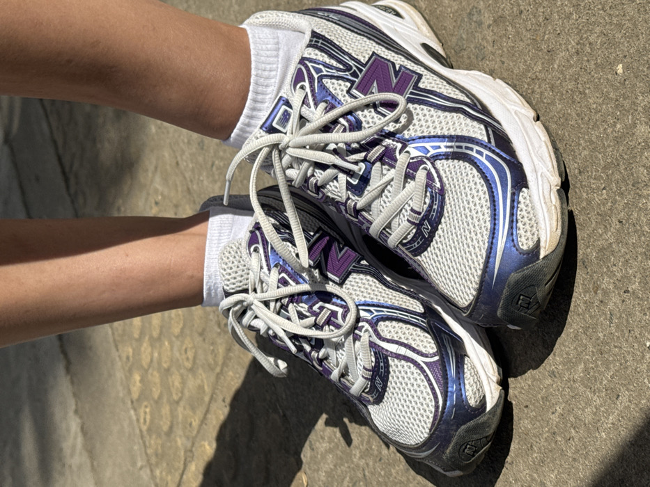 A person's legs are angled on a textured gray surface, with shadows nearby. They wear white socks and New Balance sneakers. The shoes are primarily white with purple and blue accents. The laces are tied. The shoes appear to be stacked slightly, with the person's legs pressing down on both. The lighting is bright, highlighting the textures and colors of the shoes.
