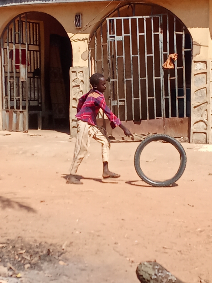 - "The scene depicts a young male individual playing with a tire on a reddish-brown dirt surface in Akwanga, Nigeria" by FM-0e8Bh2, licensed under CC BY 4.0