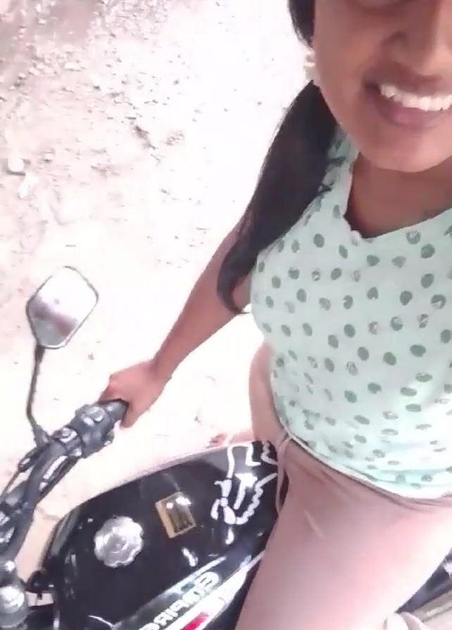 A medium shot shows a woman sitting on a black motorcycle outdoors. She is facing the camera, smiling, and holding the handlebars. She has dark hair pulled back into a ponytail and is wearing a light green polka dot shirt and pink pants. The ground appears to be a light, gravelly surface.