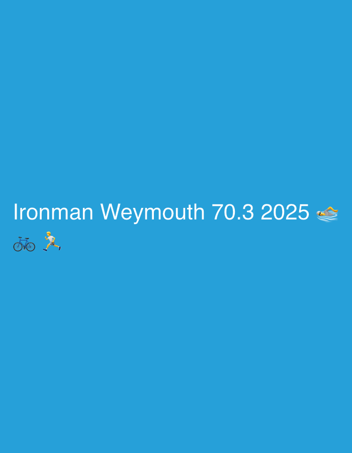 The image displays a digital graphic on a solid blue background. Centrally, the white text "Ironman Weymouth 70.3 2025" is presented. To the left of this text, a black outline bicycle emoji (🚲) is positioned next to a running person emoji (🏃) depicted with a yellow top and beige shorts. To the right of the text, a swimming shoe emoji (🌊👟) is visible, showing a white and blue shoe partially submerged in blue water. The graphic functions as an announcement for the Ironman 70.3 triathlon event, signifying its occurrence in Weymouth, United Kingdom, during the year 2025, with the emojis representing the swimming, cycling, and running components of the race.