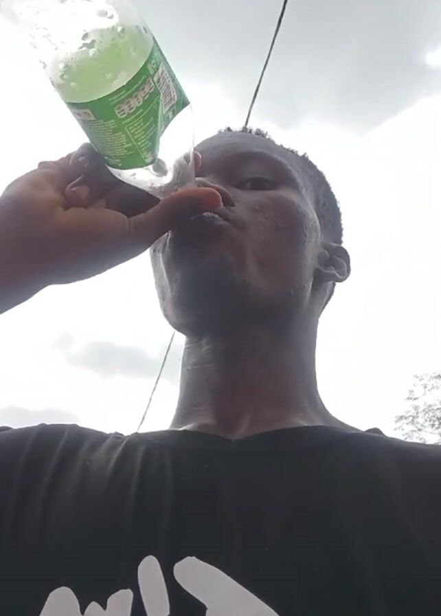 A young man is drinking from a green-labeled plastic bottle. He is wearing a black t-shirt with a large white design on it. The camera angle is from below, looking up at the man against a cloudy sky. Overhead electrical wires can be seen in the background. The bottle has condensation on it.