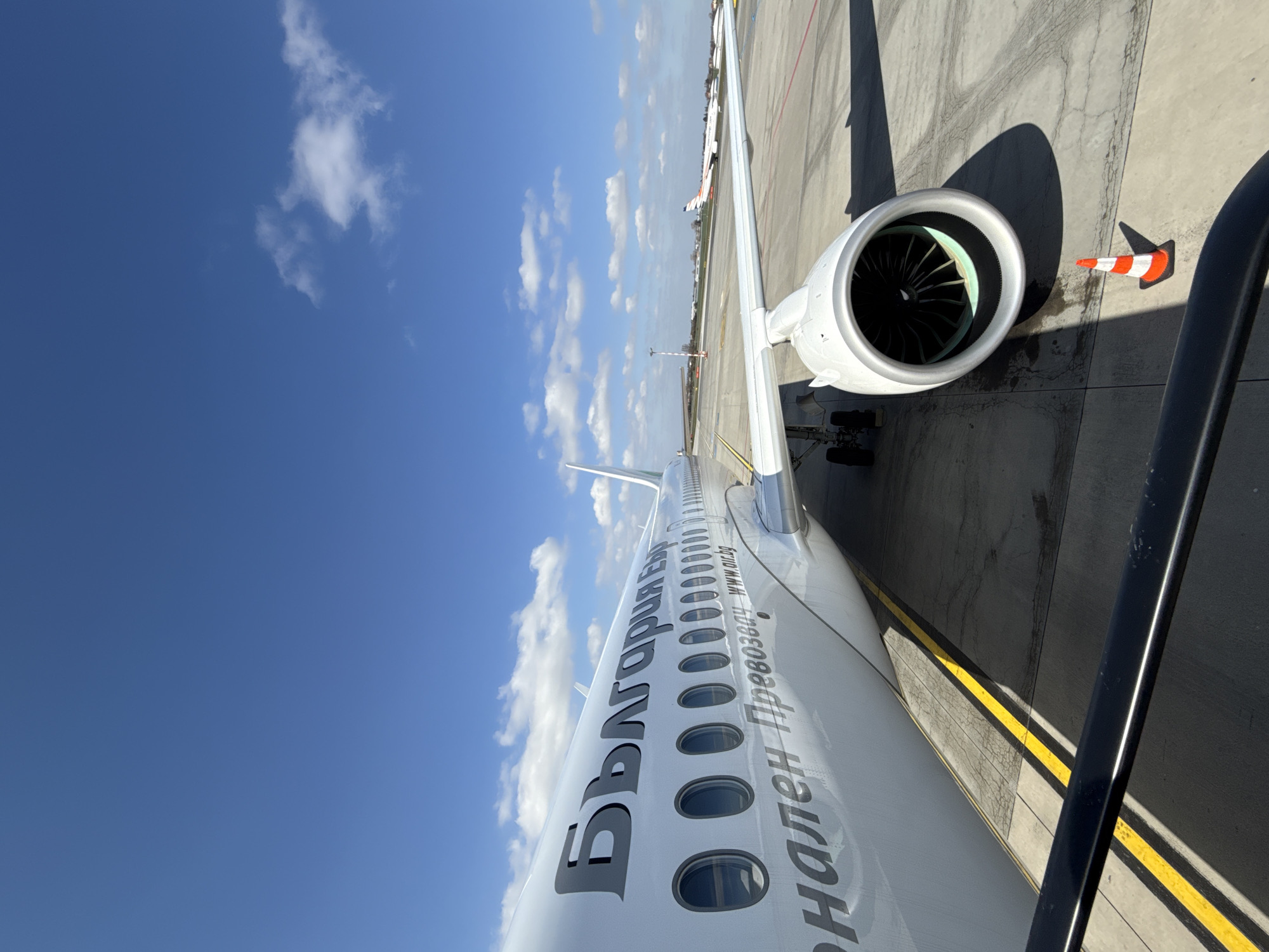 The image displays the left side of a Bulgaria Air commercial passenger aircraft parked on an airport tarmac in Kněževes, Czechia, consistent with Václav Havel Airport Prague. The aircraft's white fuselage prominently features "България Ер" in dark grey Cyrillic script, with "национален превозвач www.air.bg" visible below a series of circular passenger windows. The left wing extends from the fuselage, beneath which is a turbofan engine nacelle, revealing internal blades with a green/teal accent ring. In the immediate foreground, a black metal railing traverses the lower portion of the frame. The grey concrete tarmac, marked with distinct yellow lines, features an orange and white striped traffic cone positioned directly beneath the aircraft's engine. No individuals are visible. In the background, other commercial aircraft are discernible on the tarmac, one exhibiting orange livery elements, all under a clear blue sky dotted with scattered white cumulus clouds. The scene is illuminated by natural daylight, casting shadows from the aircraft and the cone.