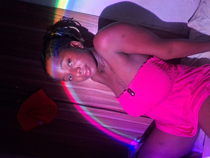 A young woman with braided hair poses in a hot pink dress under a rainbow prism light effect