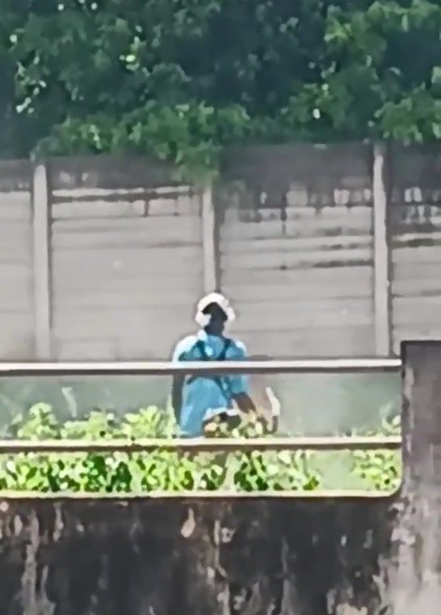person from behind, wearing a blue shirt and white hat, sitting in a low area filled with green plants. The person appears to be working or moving around within the vegetation. The view is partially obscured by a rusted metal railing in the foreground. Behind the person and the vegetation, there's a grey concrete fence and a backdrop of green trees. Another person walks into view briefly to the right of the subject. The sound of an engine is present in the video.