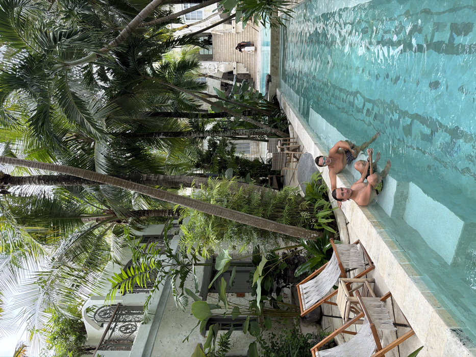 Two men are sitting on the edge of a long, narrow swimming pool. The pool is surrounded by lush greenery, including palm trees. Three empty lounge chairs are placed in front of the pool. A white building with decorative black railings is visible through the trees. A staircase is behind the pool, and a person is walking up the stairs.