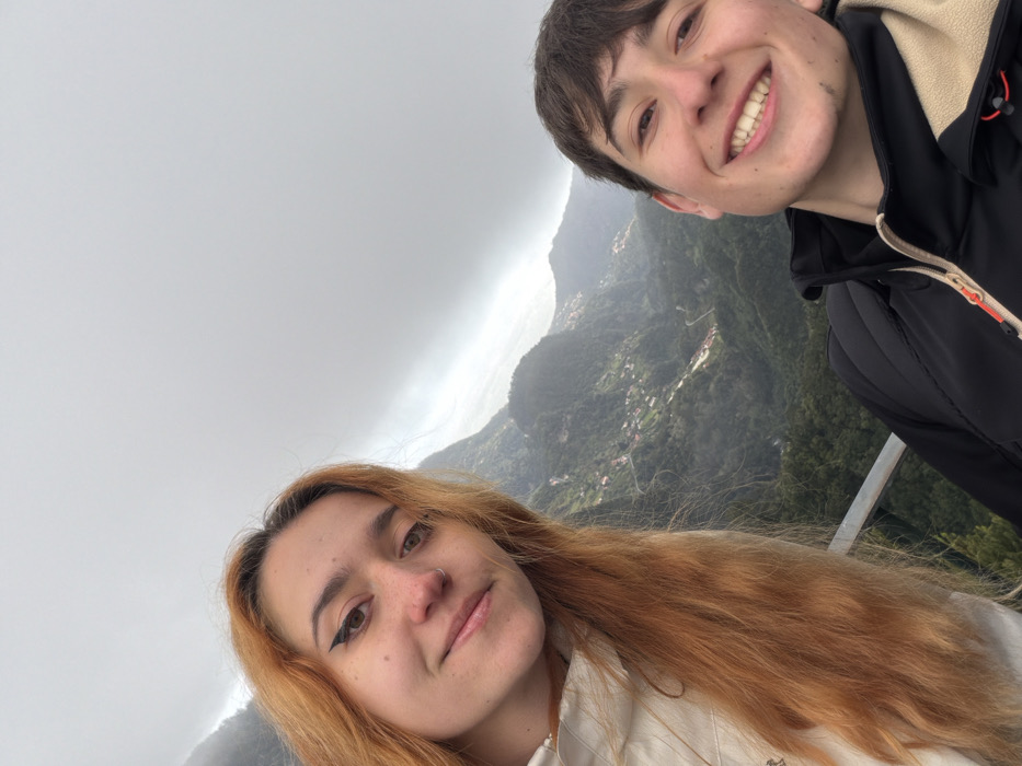 A selfie-style photograph depicts two young adults in the mountainous region of Santana, Portugal