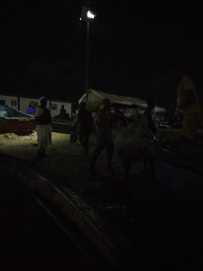 A nighttime scene depicts several figures on a beach or shore. Some individuals appear to be working near boats, while others stand or move in the illuminated area. A tall light pole casts a bright glow on the immediate surroundings. In the background, buildings and a tent-like structure can be seen, adding depth to the scene. The overall atmosphere is dark, with only select areas lit by artificial light.