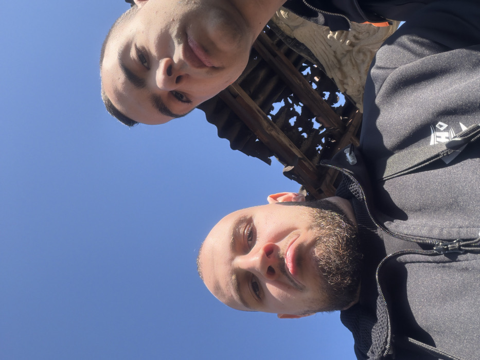 The image depicts two adult males in a low-angle selfie, positioned outdoors under a clear blue sky