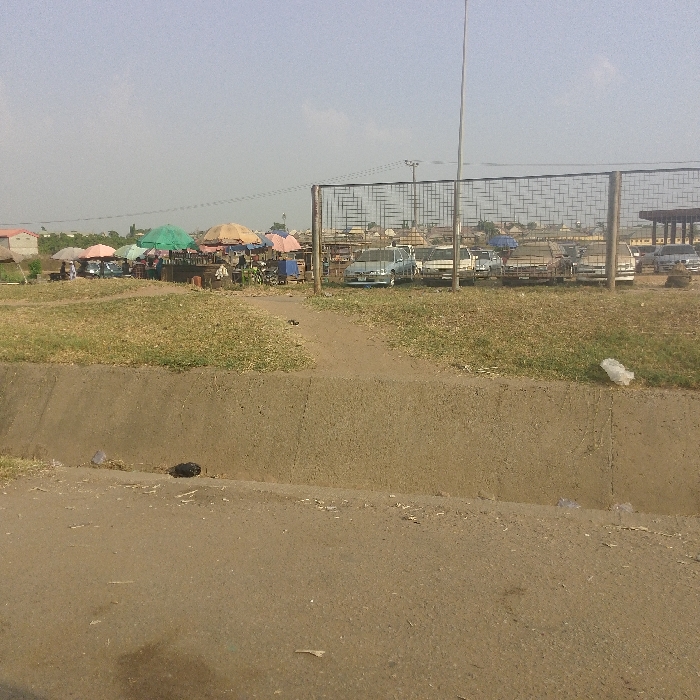 This image depicts an outdoor market scene in Sabojibi, Nigeria. The immediate foreground features a dirt and paved surface, leading to a horizontal concrete drainage ditch containing some debris, including a white plastic bag and a dark object. Beyond the ditch, an area of dry, sparse grass extends towards the midground market. In the midground, numerous vendor stalls are present, covered by various colored umbrellas, specifically pink, green, beige, and light blue. Several individuals are visible near these stalls, suggesting market activity. Small vehicles, consistent with motorcycles or tricycles, are parked amongst the stalls. A tall, dark metal fence with an intricate geometric pattern forms a barrier across the scene. Behind the fence, a parking lot contains multiple parked vehicles, including cars, vans, and possibly trucks. Distant buildings are discernible on the hazy horizon. A tall, slender utility pole stands vertically on the right side of the frame, extending above the background structures against a bright, slightly overcast sky.