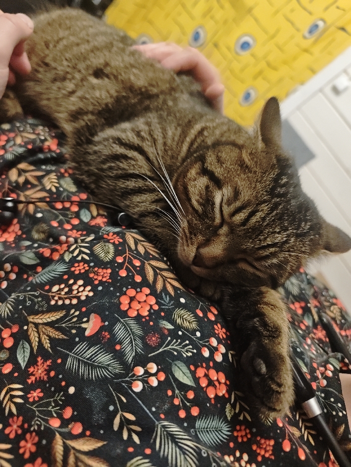 - "A brown tabby cat is depicted sleeping on a human's lap or chest in an indoor setting located in Свистуха (кузяевский С/о), Russia" by FM-P9SdV2, licensed under CC BY 4.0