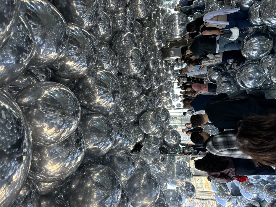 The image depicts the "Clouds" art installation at Summit One Vanderbilt in New York City, United States. The interior space is densely populated with hundreds of large, reflective silver spherical balloons or orbs, which cover both the ceiling and the floor, creating an immersive, multi-reflective environment. Approximately 20 to 30 individuals are visible throughout the installation, casually dressed, standing, walking, and observing the scene. Through large, clear windows on the left side of the frame, a high-rise urban landscape of New York City is discernible, with various buildings under a bright sky. The reflective surfaces of the spheres and surrounding elements multiply and distort reflections of the people and the external cityscape.