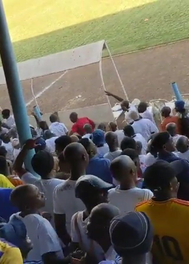 crowd of people at a soccer stadium, likely cheering. The majority of the people are wearing white shirts, some have hats or caps on. Some individuals are wearing other colors, like yellow and blue. They are mostly seen from the back, and many are raising their arms in excitement. The crowd appears to be located in a section of the stadium with basic seating. In the background is the soccer field with a player visible in orange near the goal. There's also a small shelter-like structure. The video captures a moment of enthusiasm, presumably tied to the soccer match.