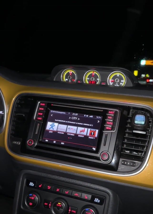 interior of a car, likely a Volkswagen Beetle, driving at night. The dashboard, finished in a distinct gold or yellow tone, is the focal point. A built-in infotainment system is displaying a radio station interface with the station "CITY" selected. Above the central console, three gauges are visible, adding to the car's retro aesthetic. The road ahead is visible through the windshield, illuminated by streetlights and the headlights of other cars, indicating the car is traveling on a highway or similar roadway. The interior lighting is minimal, creating a dark ambiance which serves to highlight the dashboard and road ahead. The car seems to be traveling at a moderate speed.